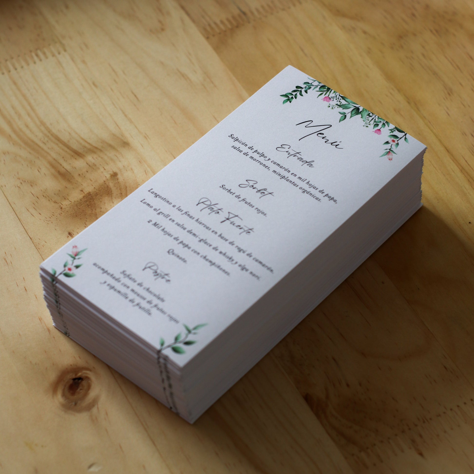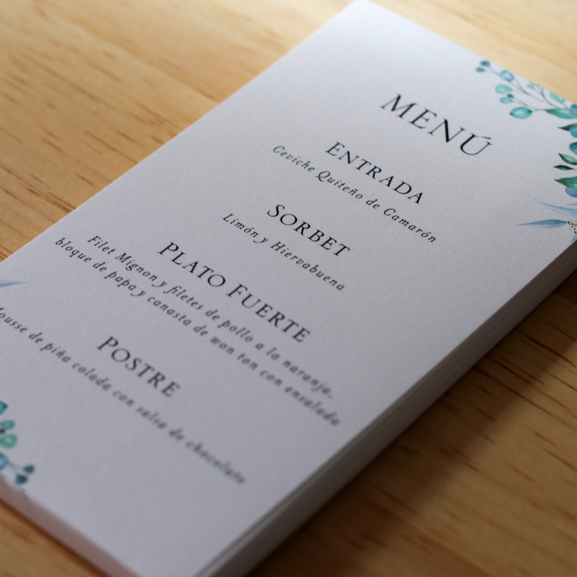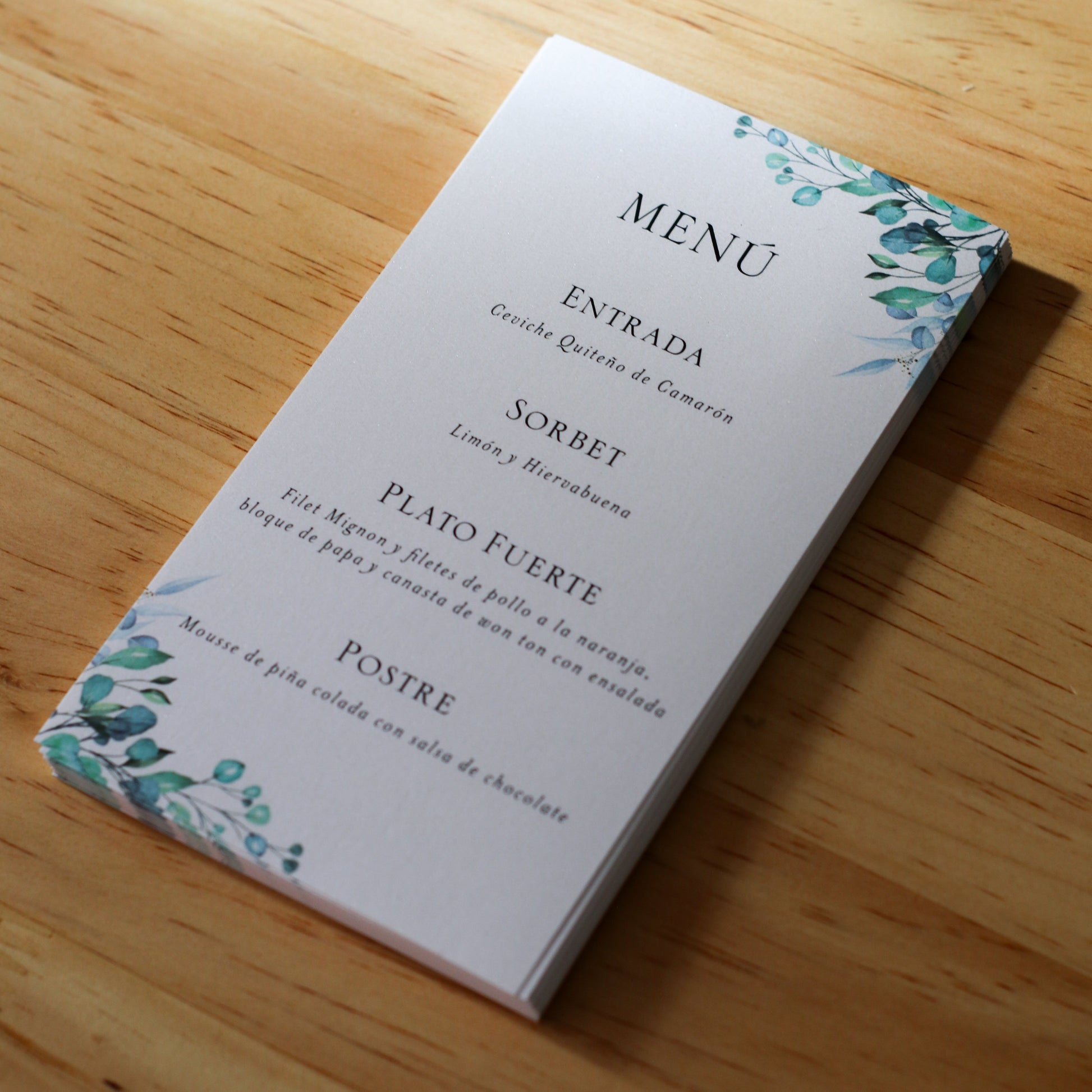 Impresos en un elegante formato de 10x21 cm, estos menús añadirán un toque armonioso a la decoración de cada mesa en tu banquete.